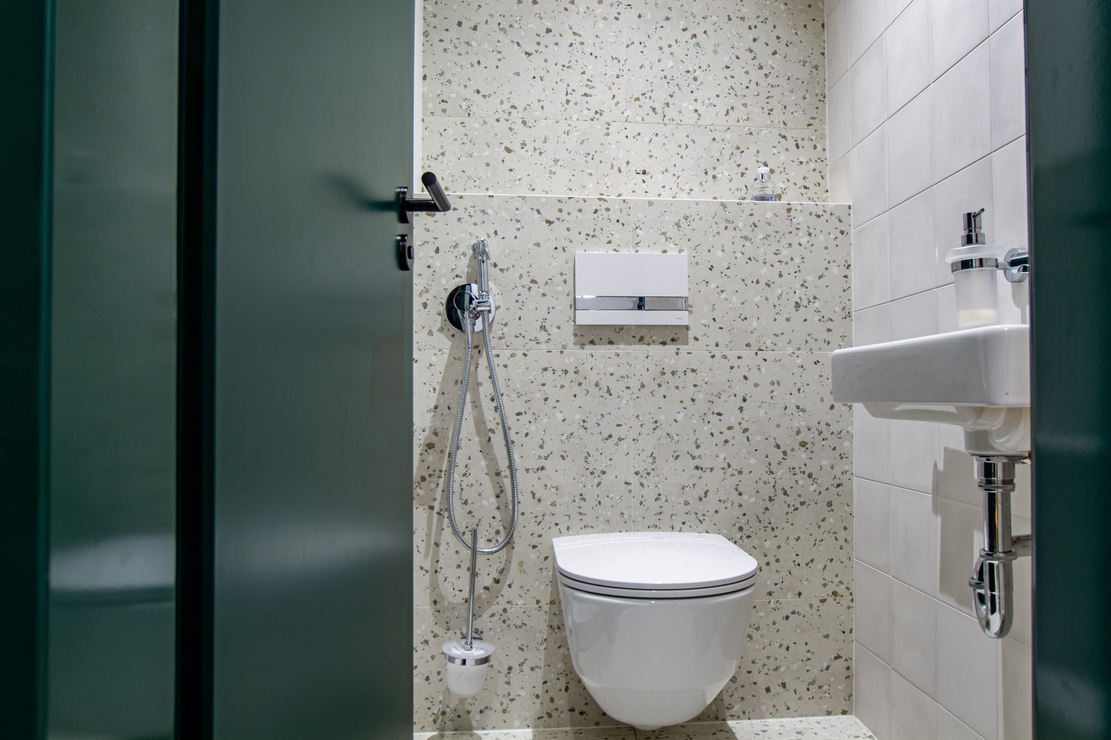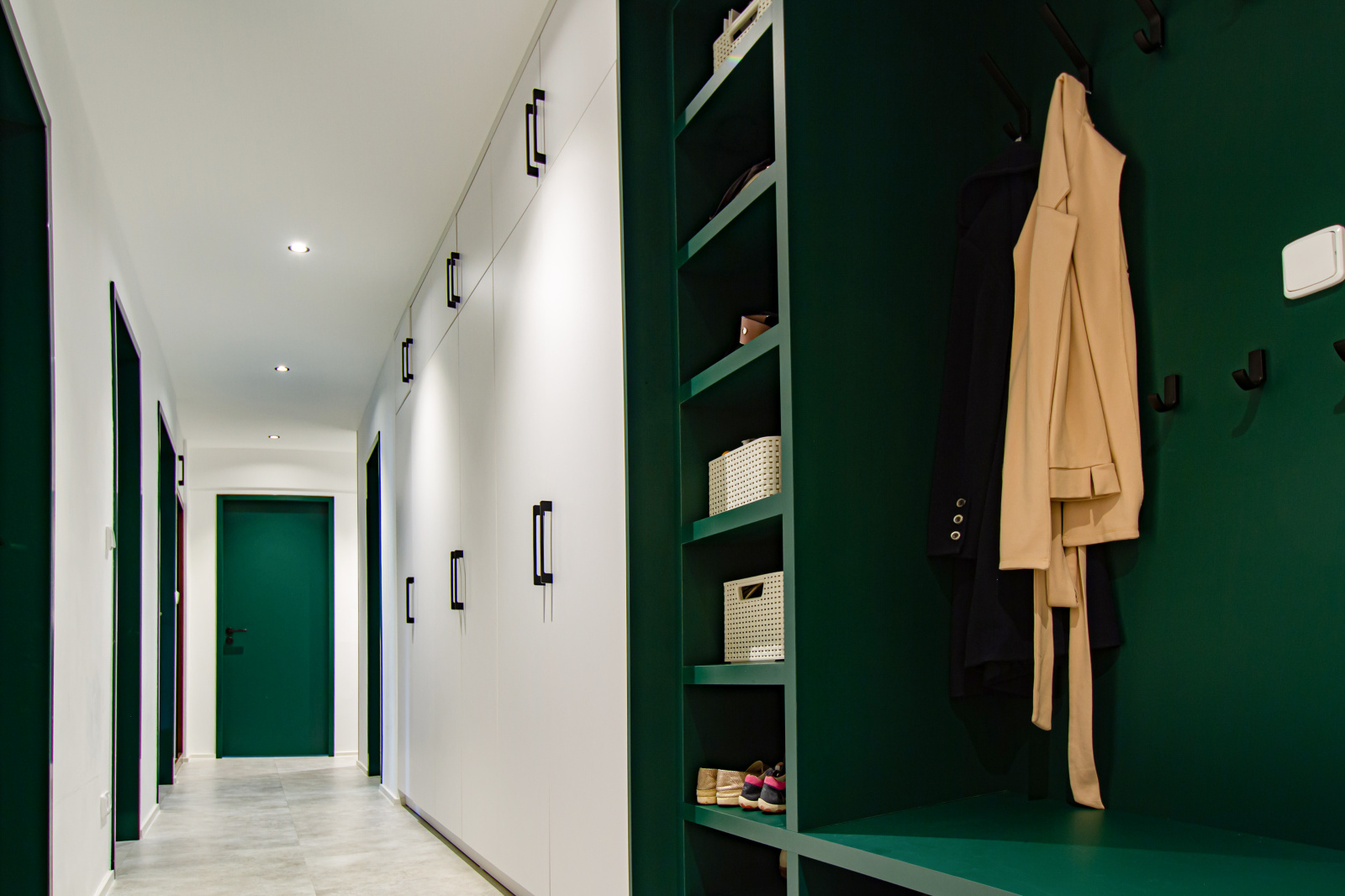 Důležitým prostorem se stalo zádveří, které je nositelem obřího množství úložných prostor. Celou dlouhou chodbu lemuje vestavěná skříň, která má v určitém prostoru skoro metrovou hloubku. Tato skříň takřka supluje komoru a ulevuje ostatním místnostem. Chodba je centrálním prostorem pro vstup do všech místností a její stěny jsou děleny výraznými zelenými dveřmi v ocelové zárubni. Ocelové zárubně jsou odkazem na historii samotného bytu, kde tyto zárubně byly taktéž použity. Zvolili jsme jen modernější, hranatější typ zárubně. Největšími prosklenými dveřmi se vstupuje do obývacího pokoje s kuchyní půdorysného tvaru L. Protože majitelé nevlastní televizi a ani příliš nevyužívají gaučové posezení, je hodně velká plocha věnována kuchyni, a také hernímu koutku pro kluky. Ten se může časem proměnit třeba i na pracovní koutek nebo relaxační zónu. Místo se přizpůsobí koloběhu rodiny. Kuchyně tvaru L má v zadní části vysokou zelenou hmotu, která skrývá všechny spotřebiče, i ty přivezené z původního bytu. Na vysoké moduly navazuje pracovní deska s velkým plynovým sporákem a dřezem.