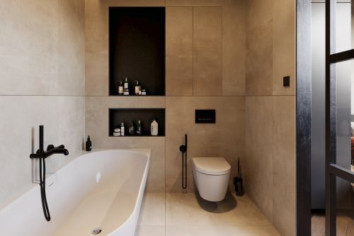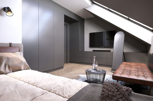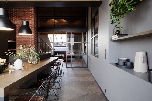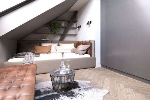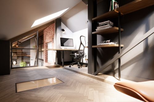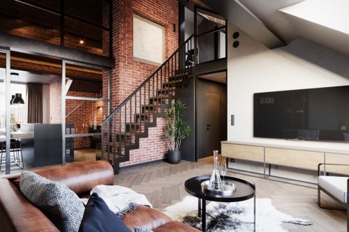 Industriální byt vznikl z developerského projektu 3 bytů v podkroví v Praze na Andělu. Každý byt je laděn do jiného tématu. Tento je industriální. Byty mají samy o sobě krásnou dispozici s vysokými stropy do podkroví. V podkroví se nachází malá galerie s pracovnou. Industriální styl se ke struktuře bytu vysloveně nabízel a zcela přirozeně si ho podmanil.