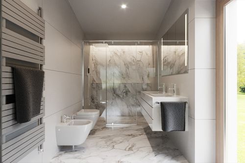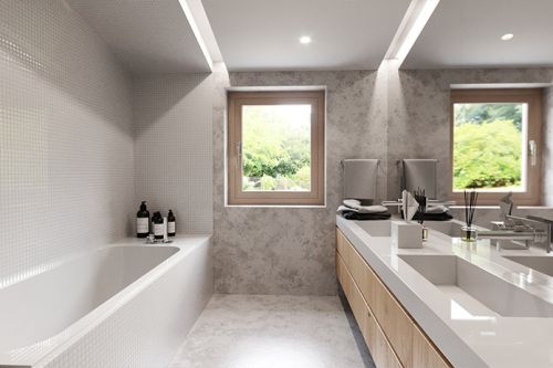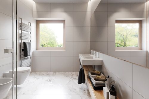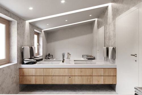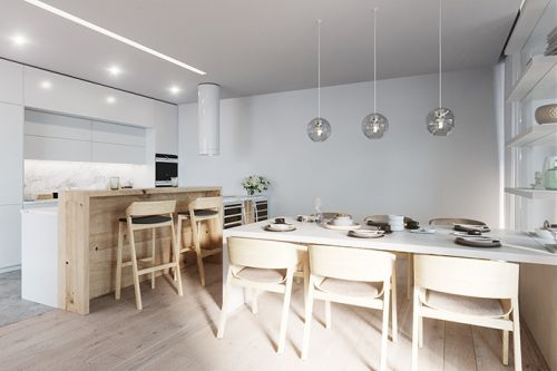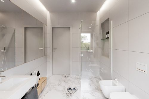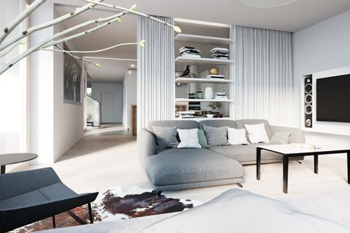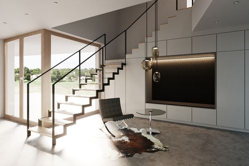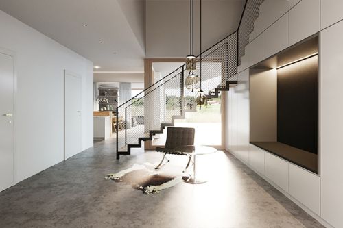 V rámci tohoto projektu jsme navrhovaly jak interiér, tak i dům samotný, jak jinak, než v pasivním standartu. Tak tedy vznikl návrh domu pro mladou rodinu. Ačkoliv se dům nachází v památkově regulované oblasti, majitelé chtěli moderní dům včetně interiéru. Hlavní dominantou interiéru je velká vstupní hala, která je otevřena do druhého podlaží pomocí velkorysého schodiště. Zároveň je skrz schodiště významný průhled od vstupu až na zahradu. Na vstupní halu navazuje příjemný obývací pokoj, který je předělen na kuchyňskou a obývací část pomocí lehkých závěsů a skleněné stěny. Součástí návrhu jsou i čtyři koupelny, které se v domě nachází. Jsou řešeny převážně ve světlých barvách s akcenty dřeva.