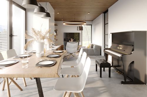 Obývací pokoj obdélného tvaru o šířce pouhých 3,35 m v rodinném domě měl za úkol hostit mnoho funkcí – relaxační obytnou část s krbem, jídelní stůl, piano a kuchyňskou linku, kterou si klienti přáli co nejvíce uzavřít od obývacího prostoru.
