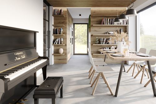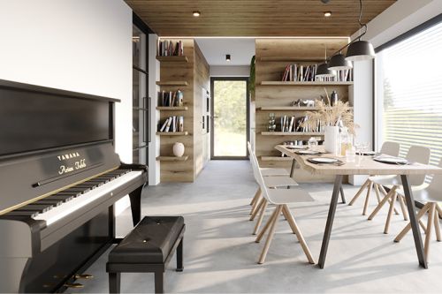 Zásadním prvkem interiéru je dřevěný podhled z desek s rýhováním. Naopak podlahová krytina je navrhnuta v nadčasovém dekoru imitace betonu. Díky jednoduchému dekoru podlahy jsme si mohli dovolit použít nábytek s dřevěnými prvky.