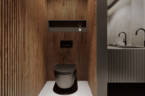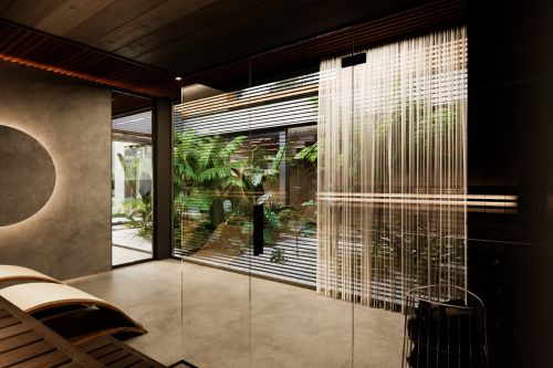 Ve moderní luxusní vile jsme navrhovali kromě klasických obytných místností také saunu a fitness.