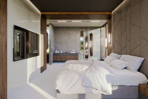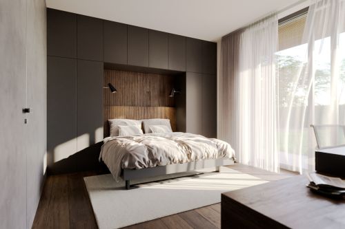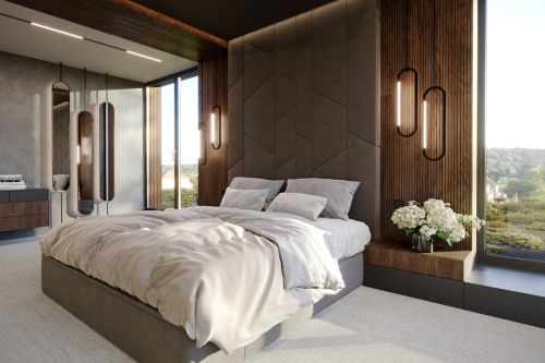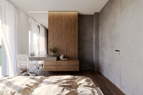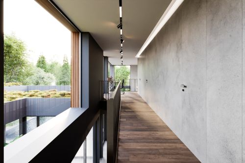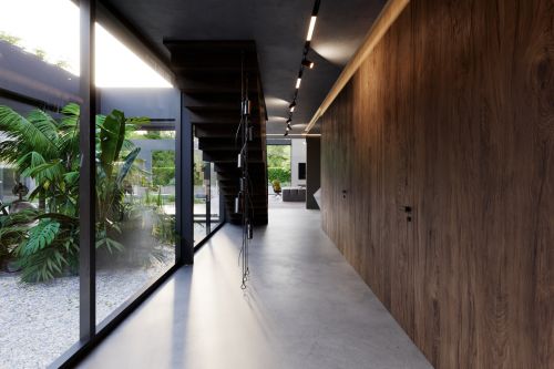 Interiér vily vznikal společně s návrhem celého domu. Klienti měli jasnou představu o tom, jak by měl být interiér laděný. Přáli si tmavší materiály, spolu s tmavším hladkým dřevem, stěrkovu a dřevěnou podlahou. Stěny neměly být bílé. Každá stěny domu je obložena, zakryta nábytkem nebo opatřeba stěrkou.