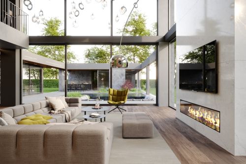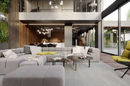 Dominantou interiéru je obývací pokoj s výškou 7 metrů. Uprostřed dispozice domu se nachází zelené atrium.