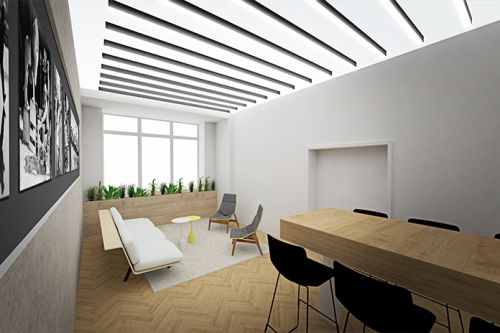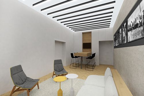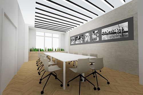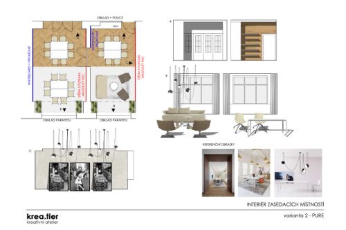 Interiér zasedacích místností je pojat netradičním způsobem. Splnění akustických parametrů je zde již samozřejmostí a novou přidanou hodnotou se stává atmosféra obou místností. Z předložených variant si klient vybral téma blízké přírodě, které se pak odrazilo na přírodních materiálech, množství květin a zemitých tónech nábytku.