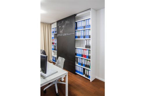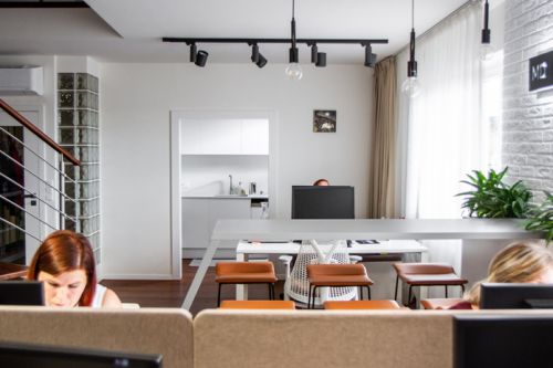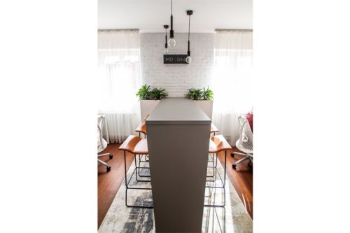 Kancelář v industriálním stylu byla rozvržena tak, aby obsáhla co největší počet pracovních míst a zároveň, aby se zde nacházel dostatečný úložný prostor, který společnost zabývající se účetnictvím vyžaduje. Dominantou prostoru je barový pult se skosenou podnoží, s koženými barovými židličkami s kovovou antracitovou podnoží. Typový kancelářský nábytek jako jsou kancelářské židle a stoly byly vybrány z portfolia společnosti Cre8. Záměrně jsme vybrali židle Sayl společnosti Herman Miller, které jsou velice subtilní a jejich design nenaruší malý prostor kanceláře.
