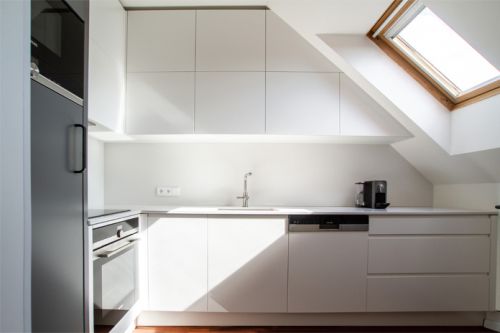 Kuchyně pro zaměstnance je umístěna v malé místnosti se střešním oknem. Design jsme proto maximálně zjednodušili. Hlavní hmotu kuchyně tvoří bílé korpusy, na které navazuje vysoký modul v šedé barvě s výrazným kovovým madlem. Pracovní deska je tvořena umělým kamenem, do kterého je zapuštěn nerezový dřez.