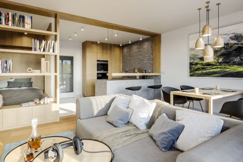 Jedná se o apartmán s ložnicí, v jehož obytném prostoru je specificky řešený kout pro spaní i relaxaci oddělený laťkovou stěnou.