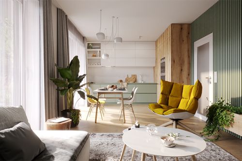 Typový nábytek je vybrán tak, aby byl pohodlný a zároveň vzdušný a výrazný.