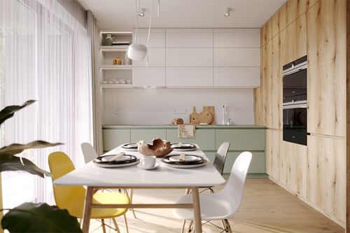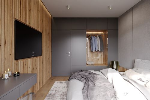Základ bytu je tvořen dřevěnou, mírně bělenou podlahou a bílými dveřmi. Vzhledem k velkému prosklení bytu jsme si mohli dovolit antracitovou, výraznou barvu kuchyňské linky, nad kterou jsme spustili laťový podhled. Jídelní stůl je důmyslně přistaven ke stavebné šachtě a pomocí pevného skla vytváří zajímavý prvek interiéru. Důležitou součástí návrhu jsou i záclony se závěsem, který má hrubou texturu.
