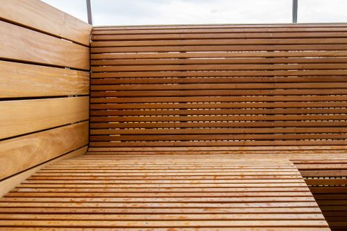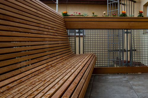 Součástí rekonstrukce malého bytu je i terasa, které jsme dali úplně nový vzhled laťovým nábytkem, který je pohodlnou lavicí a lehátkem zároveň. Součástí konstrukce je i podlouhlý květináč v místě zábradlí.