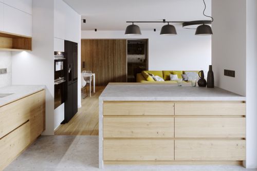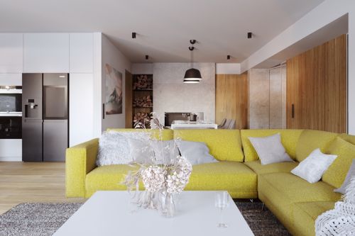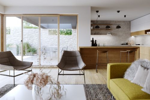 Ústředním bodem domu je obývací pokoj spojený s jídelnou a kuchyňským koutem. Jídelně dominuje velký bílý moderní stůl s pohodlnými čalouněnými židlemi a krb opatřený stěrkou. V obývací části je jasně žlutá rohová pohovka s nastavitelnými opěrkami hlavy, která barevně oživuje interiér. Televizní stěna je obložena stejným kamenným obkladem, který se vyskytuje v exteriéru. Kuchyňský kout je materiálově tvořen svěží kombinací betonu, dřeva a bílé barvy. Kuchyňský ostrůvek tvoří dělící linii mezi kuchyní a obývacím pokojem, kde slouží jako barový pult doplněný moderními barovými židličkami v hnědé kůži.