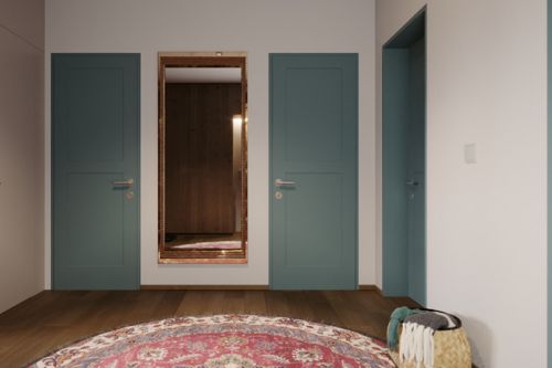 Výrazné barevné schéma petrolejové zelené barvy, tmavého dřeva a světle šedé, s doplněním světle hnědé kůže, je použité v celém interiéru. Hlavním cíli návrhu bylo vytvoření velkého množství úložného prostoru, převážně na knihy, zakrytí topení a vytvoření galerie pro oblíbené obrazy majitelky.