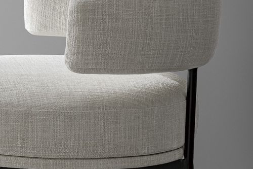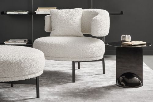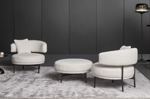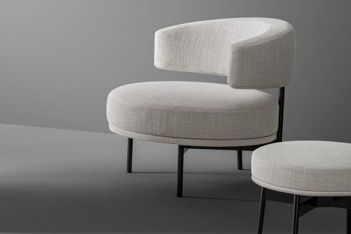 Fabrice Berrux completes the Neuilly seating collection (which includes a chair and stool) by enriching it with the Neuilly lounge armchair and Neuilly pouf. The immediately recognizable slender tubular metal frame supports the large volumes of the seat and the backrest/armrest which, with its semi-circular shape, welcomes you in a comfortable embrace. The Neuilly lounge armchair is the ideal complement both in the various different rooms of the house from the living area to the sleeping area, and also in hospitality spaces.