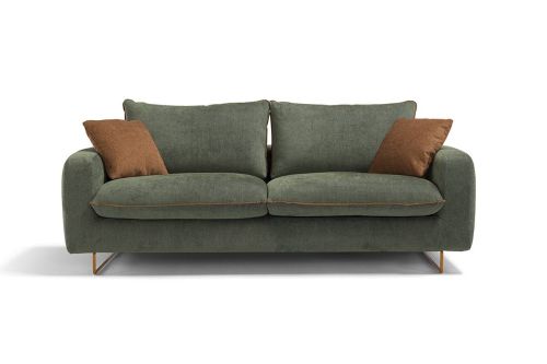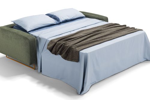 Mechanism: convertible sofa bed with standard electro-welded mesh, feet h 13 cm, without pillow storage compartment. Padding: standard stretch polyurethane D.30 h 13 cm mattress. Seat: 30 kg/m3 density. Backrest: goose down. Feet: in iron, available in a variety of colours. Optional: available in the version without bed. Optional mattresses available. Upholstery: completely removable fabric. Partially removable leather. Two complimentary Model D24 cushions in the same colour and category as the sofa.