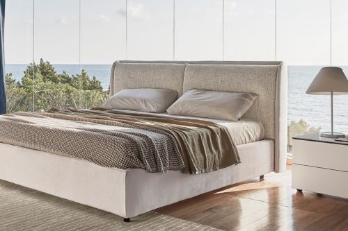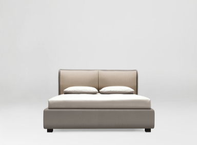 Dolly puts an original slant on the traditional headboard which envelops the edges of the bed from the bottom, swathing it like an elegant shell and uniting the two separate cushions. Available with three versions of the feet in wood and one in metal with the option of choosing the look and height from the ground that suits the customer best. The bed is designed for a fixed bed base or container unit. Upholstered in fabric or leather with the option of choosing from a variety of materials and finishes for the cushions and external shell of the headboard. Dolly fuses contemporary cool and an artisanal aesthetic which brings its sartorial stylishness to the fore.