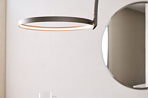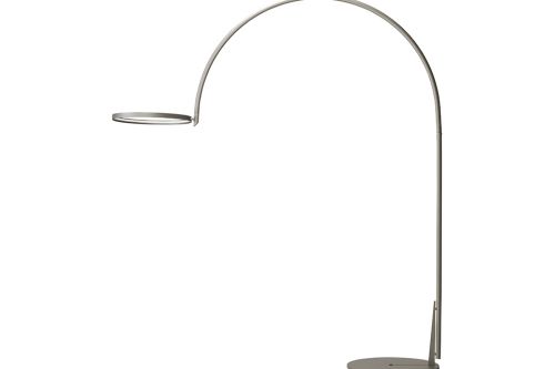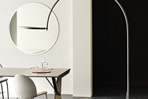 The Arx arched floor lamp is a design by Giorgio Cattelan. Entirely finished in metal, this modern floor lamp is a distinctive element of the living area with a strong decorative character. This modern floor lamp features a perfect geometric balance. The round, full base contrasts with the luminous circumference on the other end of the arched structure. The decorative details are minimal, but no less striking. Looking at the base of the design floor lamp, you can see a hole whose shape seems to reproduce the section of the lamp seen from above; to this is added a slender triangular solid that connects the large metal arch to the base, making the structure more dynamic and original. The last elegant and discreet detail is the diagonal cut at the end of the arched structure, which delicately joins the circumference equipped with internal LED lights.
