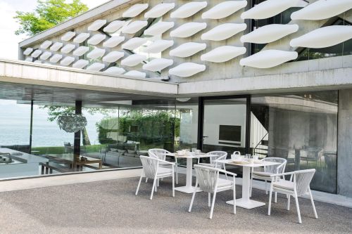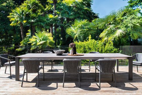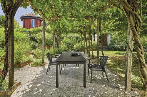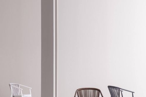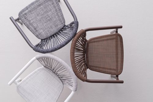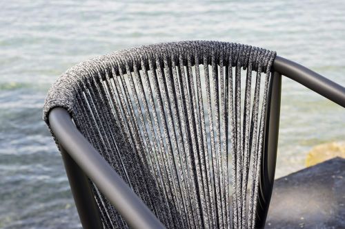 The design of the Smart armchair comes from the perfect balance between the enveloping curve that outlines the backrest and the dynamic verticality of the weave in synthetic VAR # TEX rope. Light and easy to handle, the Smart armchairs are stackable in groups of four, a quality that makes them the perfect choice for outdoor areas in the contract world.