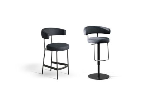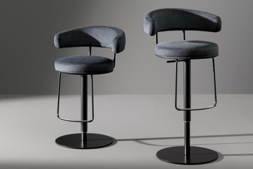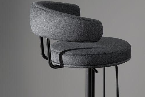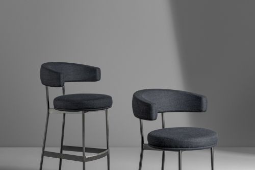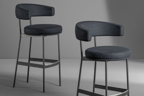 Neuilly too stands out for its delicate image and unique formal qualities which combine the geometric purity of the classic stool with a level of comfort that is evident at first glance. The slender proportions of the linear metal frame further highlight the circular padded seat while at the same time the ergonomic profile of the welcoming backrest/armrest offers a natural seating position and guarantees the stool great ease of use both in bar spaces and facing counters in dining areas.